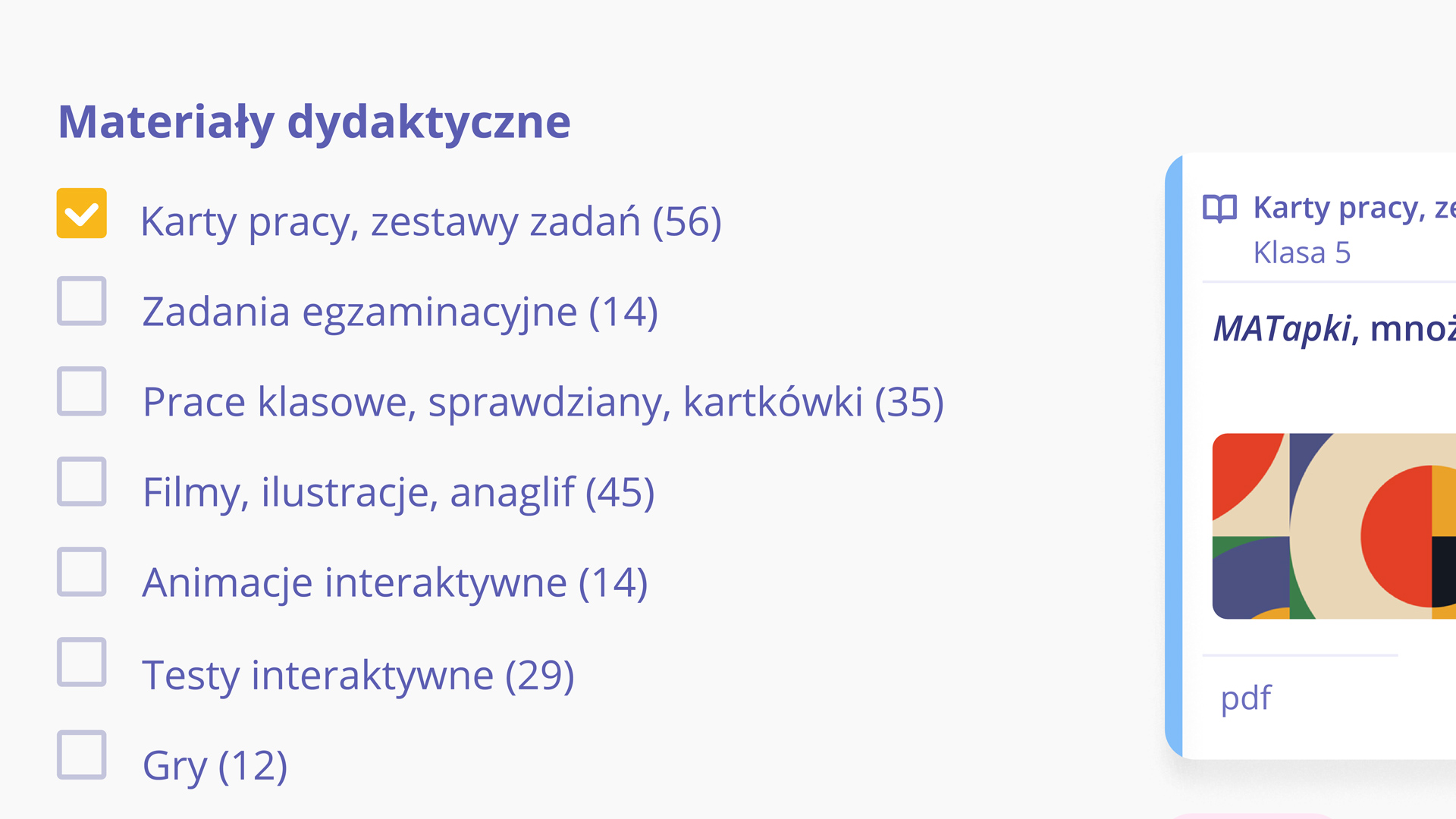 Dzięki intuicyjnym filtrom i precyzyjnemu systemowi kategorii w kilka sekund znajdziesz idealnie skrojone materiały – od multimediów po gotowe sprawdziany.