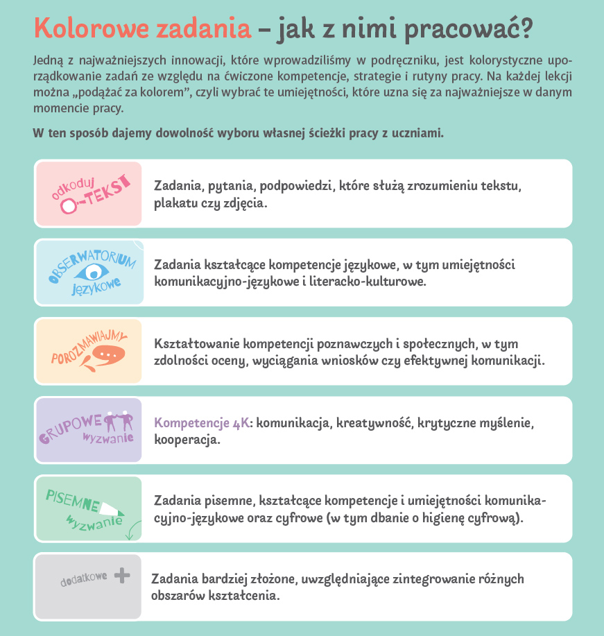 Nasze nowe podręczniki stworzyliśmy przy wykorzystaniu kolorowej metodyki. Zastosowanie tej koncepcji daje nauczycielowi dużą swobodę wyboru kształconych umiejętności w zależności od potrzeb i preferencji: