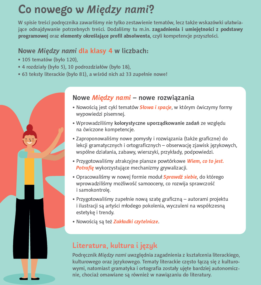 Seria Między nami w starszych klasach szkoły podstawowej wyróżnia się starannym doborem ciekawych tekstów literackich, pomysłowymi poleceniami i urozmaiconymi zadaniami, które oprócz innych zalet mają i tę, że pomagają uczniom przygotować się do egzaminu. Ważną częścią podręcznika obok treści literackich i kulturowych są zagadnienia z nauki o języku.